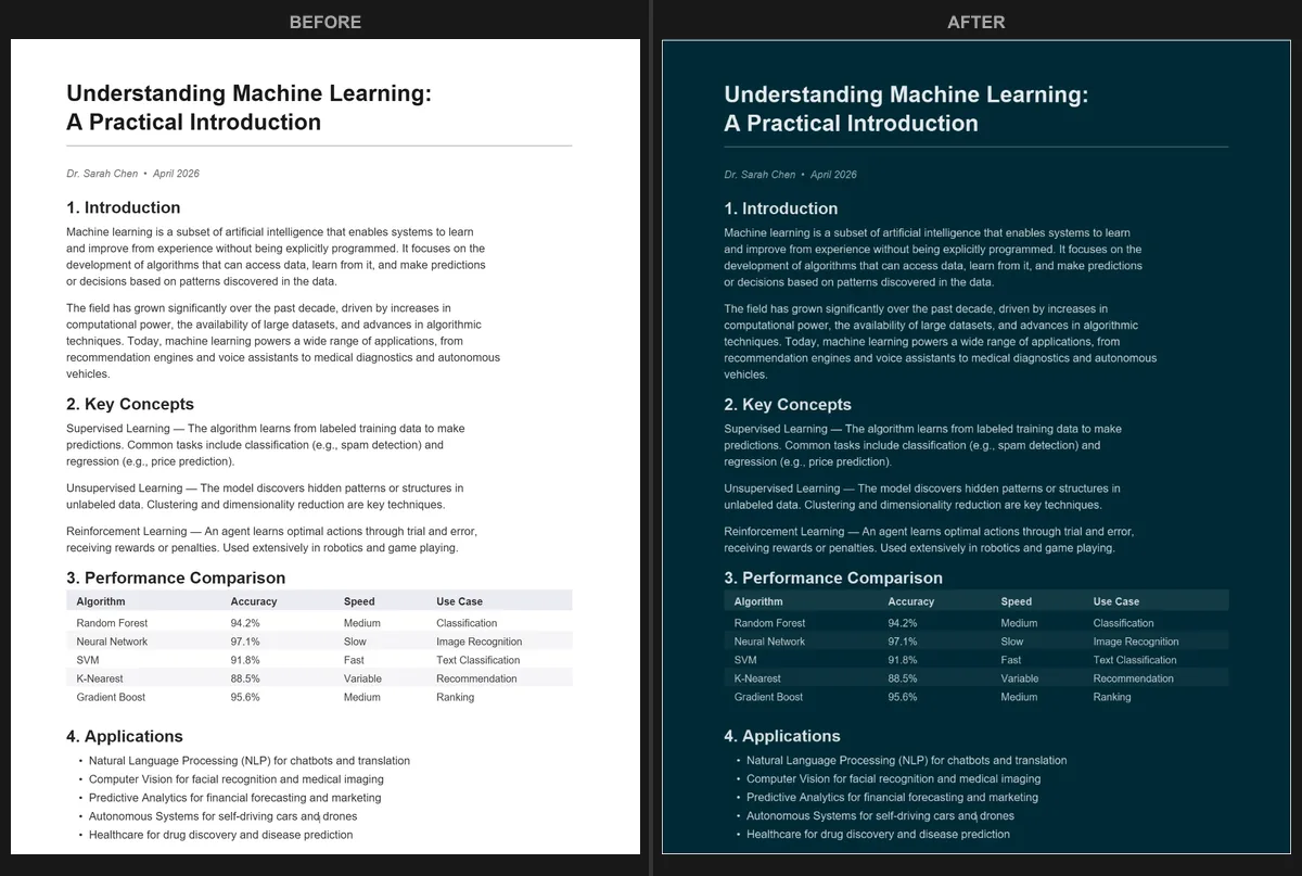 Original white PDF (left) converted to the Solarized Dark theme (right). The file is permanently dark - no Chrome flags needed.