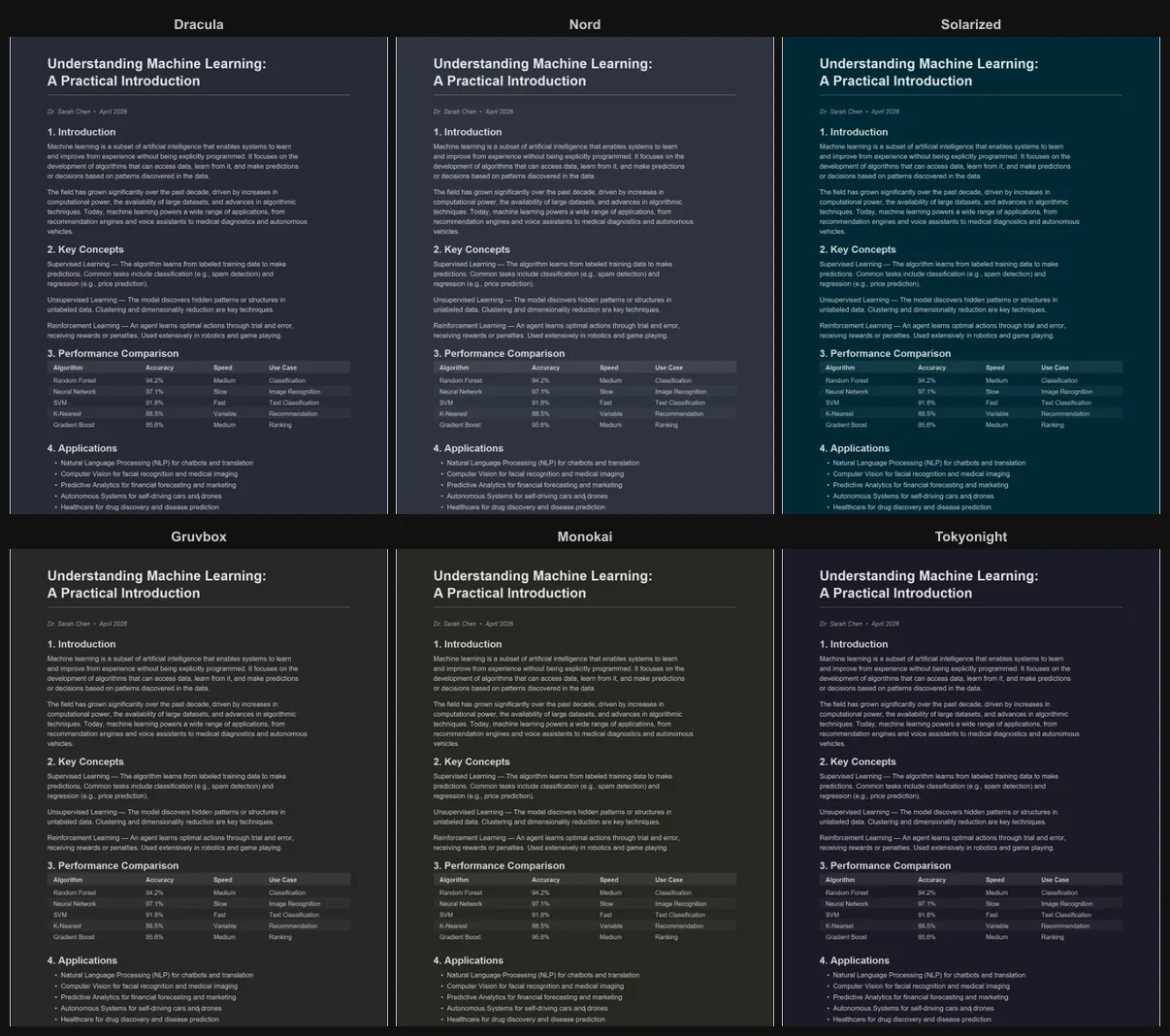 - Dracula, Nord, Solarized, Monokai, Tokyo Night and other popular developer themes